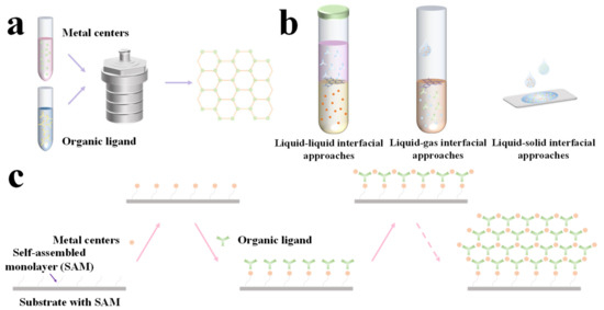 Strategies for the synthesis of c-MOFs. (a) Hydro/solvothermal synthesis, (b) the interfacial strategies for the synthesis of c-MOFs films, (c) the layer-by-layer self-assembly strategies for the synthesis of c-MOFs films.