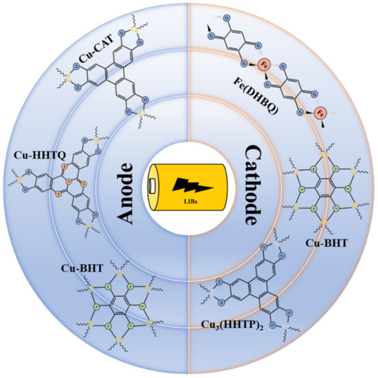Although LIBs are the most potential batteries, they also have several shortcomings. For example, uncontrollable lithium dendrite growth in the reaction process leads to short life cycle and reduced safety performance [71,72,73,74,75]. Researchers have continuously improved the performance of LIBs through various processes [76]. C-MOFs, as structurally tunable porous materials, can facilitate charge transfer and increase LIBs’ reaction rates, owing to their high electrical conductivity. Numerous active sites can be designed according to their tunable structures. The large pore structure of c-MOFs can provide abundant storage sites for lithium ions and inhibit lithium dendrite growth. Therefore, introducing c-MOFs to LIBs is a promising strategy (Figure 6). This section reviews the recent achievements of c-MOFs as anode and cathode materials for LIBs in sequential order.