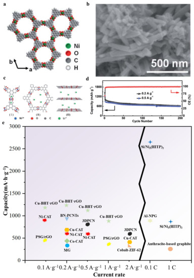 Figure 7e shows the comparison of c-MOFs anode (Ni–CAT, Cu–CAT, Co–CAT, Cu–BHT·rGO, Si/Ni3(HITP)2) with some conventional carbon-based materials as anodes, such as porous graphite/rGO (PSG/rGO), cobalt–ZIF–62, modified graphite (MG), anthracite-base graphite, layers of nanoporous graphene (NPG) on the surface of Al thin films (Al–NPG), porous carbon nanotubes webs with high level of boron and nitrogen co-doping (BN–PCNTs), three-dimensional interconnected porous carbon nanoflakes (3DPCNs) [94,95,96,97,98,99,100]. As can be seen from the figure, the Cu–BHT·rGO and Si/Ni3(HITP)2 have obvious advantages at current densities of 0.1, 0.2, 0.5 and 1 A·g−1 or at rates of 0.1 and 1 C.