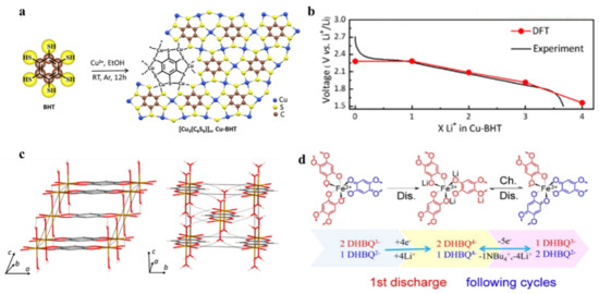In addition to the construction of c-MOFs anodes, cathodes use c-MOFs to enhance battery performance. As cathode materials, the large aperture structure and high conductivity of c-MOFs could effectively improve the cathode capacity. In 2019, Gu et al. prepared a Cu3(HHTP)2 c-MOF cathode for LIBs (Figure 8a) [83]. The size of Cu3(HHTP)2 nanosheets was ~20–40 nm, showing an irregular shape. Figure 8b shows the high-resolution transmission electron microscope images. According to Brunauer–Emmett–Teller analysis, the specific surface area of Cu3(HHTP)2 reached 506.08 m2·g−1. The ideal specific surface area and effective pore structure of c-MOF were essential for lithium-ion embedding. During the charge/discharge cycling test with Cu3(HHTP)2 as the cathode, its discharge capacity increased with the number of cycles, indicating that the Cu3(HHTP)2 cathode was relatively stable. The capacity of the coin LIBs assembled with c-MOF as the cathode was 95 mA·h·g−1 after 60 cycles, and the CE value was 50% after 500 cycles. The capacity decay rate was 0.09% per cycle, and the CE value was 100%. During the discharge process, each unit of Cu2+ was reduced to Cu+ through the insertion of a Li+ unit. Correspondingly, a unit of Li+ was released during the charging process, and each unit of Cu+ was oxidized to Cu2+. Figure 8c,d show the capacity change of coin LIBs assembled with Cu3(HHTP)2 as the cathode g at a high current rate. The capacity of coin LIBs gradually decreased with enhanced current rates. As a low current rate was restored, the battery capacity was recovered, exhibiting good reversibility. The capacity retention rate of coin LIBs increased with the increasing current rate. After 500 cycles at 20 C, more than 85% of the battery capacity was maintained with a decay rate of 0.023% per cycle. In 2020, Wu et al. synthesized a Cu–BHT 2D c-MOF through the self-assembly reaction of a BHT monomer and Cu(II) salt in ethanol (Figure 9a), exhibiting room temperature conductivity of 231 S·cm−1 [84]. The thermogravimetric analysis and acid-base tests revealed that the c-MOF exhibited high thermal and chemical stability. Figure 9b shows the experimental and theoretical calculation results. The c-MOF was used as a cathode material for LIBs with the potential range of 1.5–3.0 V (versus Li+/Li), and a four-lithium-ion storage reaction at redox-active sulfur atoms occurred on each Cu–BHT unit. The electrochemical test revealed that the reversible capacity of Cu–BHT as the cathode was 232 mA·h·g−1, which was close to its theoretical capacity of 236 mA·h·g−1, and each unit of Cu–BHT stored ~ 3.94 lithium ions. The lifespan and rate capacity of the Cu–BHT cathode were tested. The results show that after 500 cycles at a current density of 300 mA·g−1, the capacity decay rate was 0.048% per cycle. After 10 days of shelving, the capacity decay rate was 98.1% per cycle. Owing to its inherent high conductivity and the strong coordination of Cu(II) and BHT in the complete π-d conjugated system, the Cu–BHT cathode exhibited good cycling performance and longer service life.