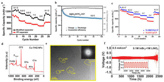Regarding the use of c-MOFs to modify the membrane, its modification on the cathode has also received attention. In 2019, Cai et al. synthesized the c-MOF Ni3(HITP)2 via a straightforward hydrothermal approach and studied its electrochemical behavior as a cathode for Li–S batteries [90]. Ni3(HITP)2 is hydrophilic and can adsorb polysulfides, and its shape is similar to the two-dimensional layered structure of graphene. Ni3(HITP)2 was an effective physical barrier that could inhibit the shuttle effect and improve cycling stability. The sulfur body in Li–S batteries required the use of c-MOFs to enhance its performance. The experimental results showed that the carbon nanotube-based S@Ni3(HITP)2 cathode displayed excellent sulfur availability, rate performance, and stable cycling endurance. After 100 cycles at 0.2 C, a high primary capacity of 1302.9 mA·h·g−1 and a good capacity maintenance of 848.9 mA·h·g−1 occurred (Figure 11b).