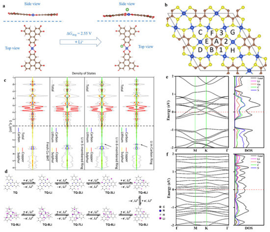 First-principles calculations that rely on DFT are crucial in scientific research. For example, DFT calculations can effectively predict the application of new materials, which is instructive for subsequent experiments and validate the experimental results. In the field of energy storage, DFT calculations can determine the stability of a material structure, calculate the free energy, and then elucidate the electrochemical reactions that occurred in the reaction process. DFT calculations can also calculate the distribution of electrons in new materials. For example, band structure and density of state (DOS) can determine whether a novel electrode material is a metal, a semiconductor or an insulator. Concurrently, DFT calculations can not only simulate the ion diffusion kinetics to elucidate the electrochemical reaction rate but also simulate the ion adsorption kinetics [133,134]. DFT calculations help to guide the experiment and save cost and time. Currently, the application of c-MOFs in the modification of rechargeable lithium batteries has not been sufficiently developed. Therefore, providing theoretical predictions and guidance for the research and development of advanced materials in this field is vital. This section reviews several works conducted via the DFT method, such as the differences between Cu3(HHTP)2 before and after lithiation, the structural changes of TQ during lithiation, the stable adsorption sites of lithium in Cu–BHT, and the advantages of Ga3C6N6 as the anode for LIBs.