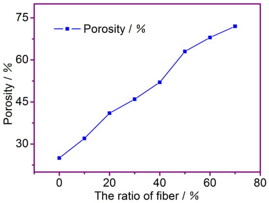 Figure 3 shows the effect of the fiber ratio on the porosity of the fiber membrane. It can be shown that the porosity of the membrane increases as the mass fraction of the modified PP and PAN fibers increases. The cotton fibers are fibrillated and dispersed into fine fibers, while the diameters of the modified PP and PAN fibers are relatively large. Because the separator obtained is formed by the uniform and random accumulation of fibers, the larger pores are formed by larger diameter fibers between them, and the corresponding porosity is relatively larger. Therefore, as the mass fraction of the modified PP and PAN fibers increases, the porosity also increases. When the mass fraction of the PP and PAN fibers goes from 40% to 50%, it is significant to see the rise in porosity. However, the growth rate of porosity decreases when the mass fraction of the PP and PAN fibers goes from 50% to 70%; their porosity is more than 60%, which can be used for a normal Li-ion battery. The data on the membrane’s porosities that correspond to the different fiber ratios are presented in Table 1.