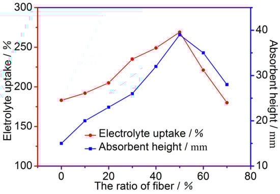 The contribution of the ability of the separator to be wetted by the electrolyte to the separator conductivity is significant. The membrane absorption ability to the electrolyte is reflected by the liquid absorption rate of the membrane, and the membrane absorption speed to the electrolyte is reflected by the liquid absorption height. It can be shown from Figure 4 that the liquid absorption rate of the fiber membrane increases as the mass fraction of the modified PP fibers and PAN fibers increases. When the mass fraction is 50%, the liquid absorption rate reaches a maximum of 269%. Then, the liquid absorption rate of the composite membrane is gradually lowered. This is mainly because the PAN fibers contain a significant amount of polar groups (-CN), and the surface of the modified PP fibers is also grafted with a polar group, which has good hydrophilic properties and better hygroscopicity. The cotton fibers can be used together to greatly improve the hydrophilic performance and the liquid absorption speed of the separator. When the mass fraction of the modified PP fibers and the PAN fibers is 50%, the aspiration height is 39 mm. However, when the liquid absorption rate of the fiber membrane reaches a certain height, the liquid absorption rate of the fiber membrane is gradually decreased as the cotton fibers gradually decrease. It will also be reduced. When the mass fraction of the modified PP fibers and PAN fibers is 50%, the liquid absorption performance is the best: the liquid absorption rate is 269%, and the liquid absorption height is 39 mm. The other data on the electrolyte uptake and absorbent height of the separators, which correspond to different fiber ratios, are presented in Table 1.