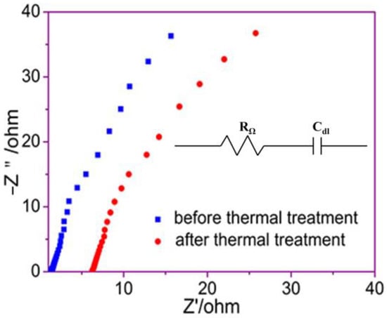 AC impedance spectra of fiber membrane before and after thermal treatment.