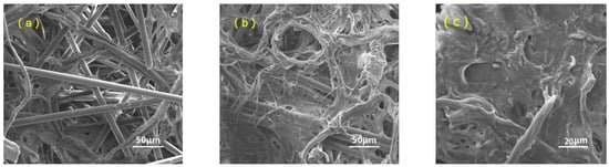 SEM of modified PP/PAN/cotton fibers composite membrane: (a) before thermal treatment; (b,c) after thermal treatment.