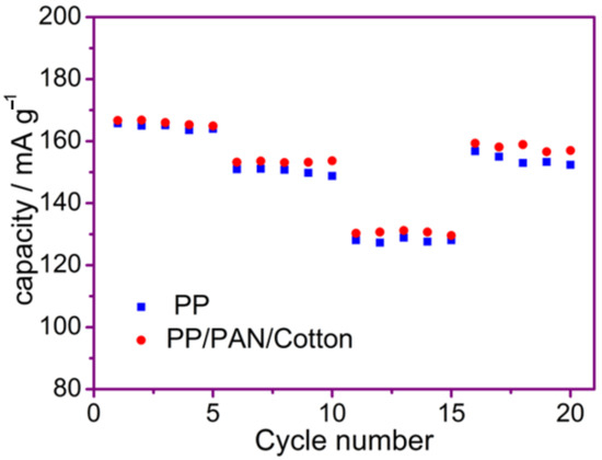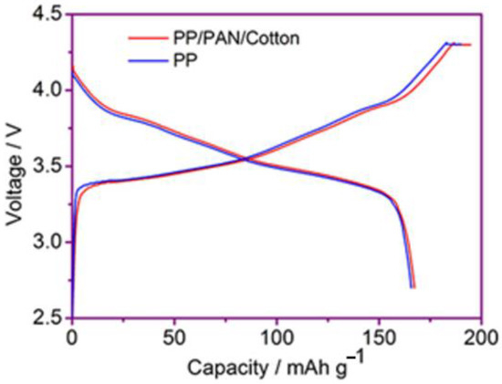 Figure 9 shows the initial charge–discharge curve of the lithium-ion batteries using the PP membrane and the modified PP/PAN/cotton fibers composite membrane at 1 C rate, respectively. It is shown that the initial discharge capacities of the batteries with the PP membrane and the modified PP/PAN/cotton fibers composite membrane were 165.8 mAh·g−1 and 166.7 mAh·g−1, respectively. Compared with the cell using the commercial PP membrane, the cell using the modified PP/PAN/cotton fibers composite membrane had a slightly higher initial charge–discharge capacity, which is due to the improvement in the electrolyte wettability of the composite membrane. Furthermore, the ionic conductivity of the composite membrane is improved, which is advantageous for the improvement in the charge and discharge performance of the battery.