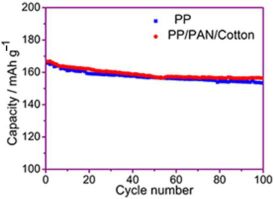 Figure 10 is the graph of the 100 cycle performance of Li-ion batteries using the PP membrane and the modified PP/PAN/cotton fibers composite membrane under 1 C rate. The discharge capacity of the cell by the PP membrane after 100 cycles is 153.4 mAh·g−1, and the capacity retention rate is 92.5%. The discharge capacity of the battery by the fiber membrane after 100 cycles is 156.5 mAh·g−1, and the capacity retention rate is 93.8%, which is slightly higher than that of the battery using the PP membrane. This may be due to an increase in the ionic conductivity of the composite membrane. Under the premise of realizing the thermal closure function of the membrane, it does not affect the performance of transporting lithium-ions of the separator at a normal operating temperature.