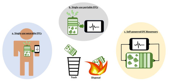 Single-use portable EFCs: Similarly, disposable, portable, single-use, low-powered EFCs can be a great application target because they do not require stable and long-lived power generation (Figure 3b). Eco-friendly disposable power sources are required to serve the increasing market for disposable electronics and sensors [94,95,96]. Furthermore, a new paradigm of the Internet of Things (IoT), named the Internet of Disposable Things (IoDT), has been developed for various applications in point-of-care testing, shipment tracking, and food/groceries monitoring [26], which means a realistic and accessible power source is needed. EFCs can be the most suitable power source that can be easily integrated into these disposable devices and be readily activated by any biodegradable substrate (e.g., body fluids, ethanol, organic acids, and sugars), which are easily available in our environment. Paper-based EFCs are great examples of those inexpensive and disposable applications [52,97,98]. Paper has recently emerged as a low-cost, disposable game-changing substrate for next-generation disposable electronics and sensors [99,100]. A self-sustainable paper-based power source allows for the creation of an eco-friendly all-paper device that can be easily disposed of through incineration [98]. Usually, microwatt-level power sources are more attractive for the short-term operation of those disposable applications and EFCs are most suitable as a low-power generator.