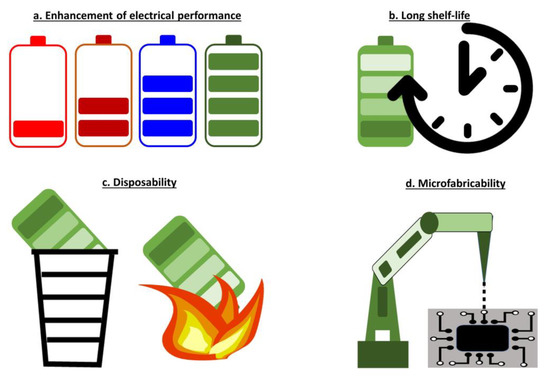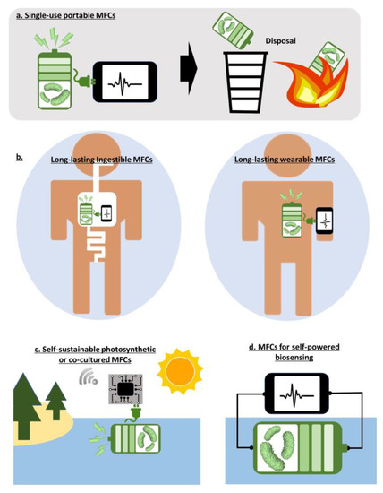 Generally, biobatteries are disposable because the catalysts are biodegradable. However, the other components must be disposable and biodegradable. Many paper-based biobatteries have been proposed as a low-cost, eco-friendly, and disposable power source for immediate single-use applications [32,119]. In particular, MFCs must be disposed of after use to prevent potential carry-over contamination and infection originating from the microorganisms.