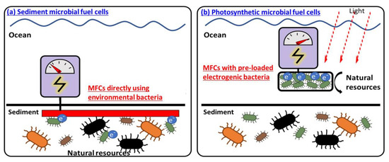Self-sustainable photosynthetic or co-cultured MFCs: With a significant size reduction in electronics and rapid advances in IoT technology, miniature wireless sensors are expected to connect every corner of the world [127]. A miniature power source is the most critical requirement for the independent and sustaining function of sensors (Figure 4c) [127,128]. MFCs have attracted much attention as one of the proper power sources for such devices as every environment generally hosts various microorganisms that can self-sustainably run MFCs [59]. In particular, a natural sediment rich in microorganisms and organic substrates is considered the best location to install an MFC where the anode is buried in the anaerobic sediment and the cathode is put in the overlying aerobic water (Figure 5a) [71]. However, the low performance of MFC using a limited number of exoelectrogens in unoptimized natural environments require a significant increase in size, which eventually does not guarantee performance improvement and develops critical challenges when anchoring, running, and maintaining the large-scale MFC in the sediment [32]. Moreover, the sediment MFCs cannot be provided in a small-scale platform for the next generation of miniature wireless sensor networks (WSN).
