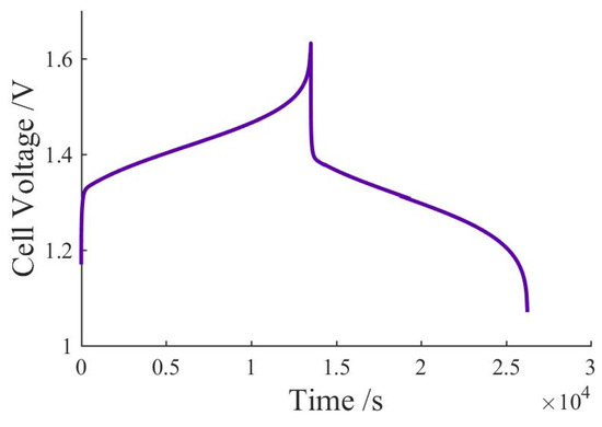 Moreover, the internal resistance is influenced by numerous factors and parameters. The electrode has the most influence, followed by the membrane and the electrolyte. Due to the electrolyte, the cell resistance is also dependent on the SOC [26]. Since the individual cell components are not known, only a qualitative plausibility check of the cell resistance can be performed. Recent studies provide a cell resistance between 0.87 cm and 1.5 cm [27,28,29]. Multiplication of the calculated value for R of 0.18 m with the surface size of the single cell approximated with 682 m, results in 1.23 cm. The resistance R calculated by the model is in the range determined by other studies and is therefore trustworthy.