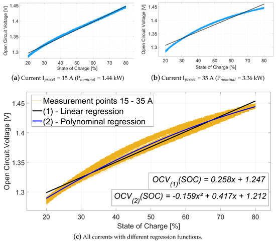 In Figure 3a good proportionality characteristics can be identified in a first approximation. At the upper end of the SOC boundary, the measurement points are congruent with the regression line. The proportional behavior becomes increasingly worse at the lower limit of the SOC, where potentially non-linear activation overpotentials occur. Within the SOC of 20 to 24%, the measured values and the regression line are no longer congruent, with a discrepancy of 0.014 V of the OCV. By increasing the current from 15 to 35 A the OCV is increasingly inadequately mapped at the lower limit as well as the upper limit of the SOC and a parabolic shape becomes increasingly apparent. With the highest possible current of 35 A, the curved-shape of the blue measured values is at a maximum. The regression line is only congruent with the linear function in the range from SOC 28.3 to 35.9% and from 60.8 to 71.2%. This equates to a percentage error of 2.68%. The error between the regression line and the calculated single points in the middle of the SOC range is 0.013 V.