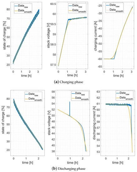 The blue line in the middle of Figure 5a shows the raw data of the stack voltage over time. During charging, the stack voltage has a proportional behavior in the range from 57.45 to 59.05 V. After that, the transition from Constant Current (CC) to Constant Voltage (CV) takes place, which can be seen by the turn after hour 1.1. Shown in yellow are the smoothed values, which only deviate from the raw data in the flattening transition to CV (hour 1.1) until its end. The discrepancy here is 0.2 V.