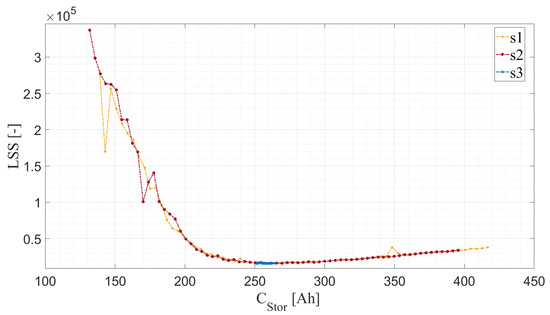 According to the simulation model explained by [1], three optimization iteration steps take place. These are marked in Figure 6 by s1 to s3. These steps are used to minimize the deviation error between model and raw data for different values of C. As the error calculation is based on the method of the least square sum (LSS) and is added for all state variables (current, voltage, and SOC) it is unitless. The first two iterations s1 and s2 occur with a fixed step size, while s3 changes depending on the step size parameter.