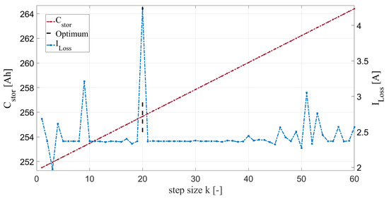 The progress of LSS within the screening rage of C during s1 is illustrated in yellow in Figure 6. The simulation model is given an initial value for the screening range of C, which represents the theoretically possible capacity of the battery system. The loop index k is used to set the resolution of the screening as a percentage of the start value. In the case of the first battery system, this extends from 138.5 Ah to 415 Ah (starting value = 277.77 Ah; k = 0.5). In general, the reduction of the step size causes an increase of the scan range.