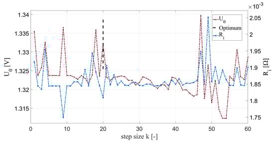 Figure 8 shows the optimization parameters R and U over the pre-configured step size of k = 60. Shown in blue is the calculation of the cell internal resistance R, which varies between 1.75 m and 2.05 m for the third optimization step. The calculated optimum is at 1.8 m. The optimum of the cell voltage U is set at a value of 1.33 V with.