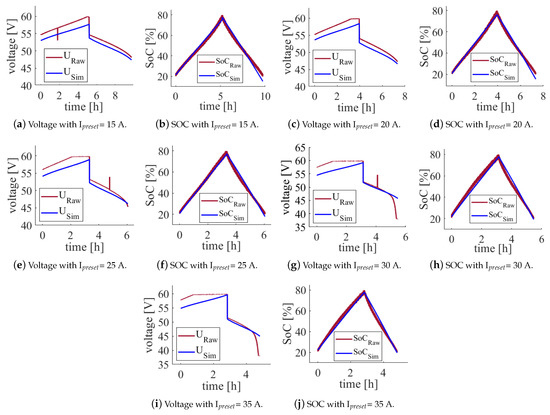 Comparison of the original raw data with the simulation data with preset current I from 15 A to 35 A based on SOC and voltage.