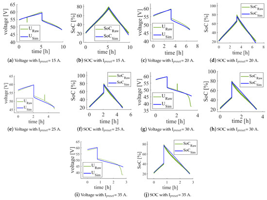 Accordingly, the limits of the simulation model are as follows. At lower currents, the behavior between 20% and 80% can be reproduced very well. As the current increases, the accuracy of the model decreases towards the end of the discharge process due to increasing non-linearities in the voltage profile. The validity range is reduced to a SOC between 20% and around 70%. In order to be able to assess the discrepancy and its effects during the charging phase more accurately. The previously described assumption is examined to see how the accuracy between simulation and measured data differs when the horizontal voltage curve (CV phase) is removed. The modified measured data was then re-extracted, smoothed and parameterized. The result is illustrated and discussed in more detail below. All separate illustrations are shown in Figure 10.
