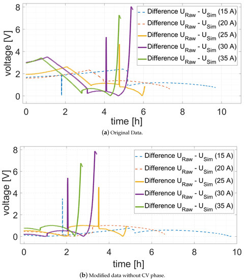 The difference between the measurement series and the simulation model are shown in Figure 11a,b. A time shift of the discharge cycles takes place by removing the CV phase of the in the charge cycle. The comparison between the errors in voltage prediction with and without CV phase clearly show that the discrepancy between simulation and raw data decreases. Thus, the error without CV phase is at a maximum of less than 1 V. Prior to this, it was at 3.64 V, which represents a discrepancy reduction of 72.5%. These results corroborate the conclusion that the simulation model can be parameterized less accurately with a CV phase. The previously mentioned discrepancy between raw data and simulation model at the end of the discharge process illustrates this effect. As this discrepancy depends on the linear approximation used in the model, non-linearities cannot be mapped adequately. At discharge currents of 30 A and 35 A, the difference decreases with 0.17 V and 0.52 V, but increases by 0.1 A at discharge current of 25 A.
