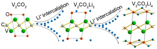 Schematic representation of the lithiation process in V-type (V2CO2, Cr2CO2, and Ta2CO2) MXenes. Reprinted with permission from [36]. Copyright © 2016, American Chemical Society.