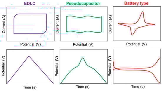 In general, there are two types of charge storage mechanisms associated with supercapacitors e.g., electrical double-layer capacitors (EDLCs) and pseudo-capacitors. In the case of EDLCs, charges are accumulated at the electrode/electrolyte interface forming an electrostatic double layer. There is no electron transfer or any redox reaction occurring for EDLC, which means energy is stored in the materials by a non-Faradic process. On the other hand, in pseudo-capacitors, transfer of electrons or Faradic redox reaction occurs being mainly independent of electrode surface area [37,38]. Moreover, electrolyte ions in pseudo-capacitors transfer across the electrode to a conducting bulk phase, although electrons or ions leave the electrode after the redox reaction. On the contrary, charges that enter the electrode do not leave the electrode in the case of non-Faradic processes [39]. Atoms that are part of the electrodes contribute to the charge storage mechanism for EDLCs and can be identified from the type of cycle voltammogram (CV) curve shape. In Figure 2, the different shapes of CV and GCD curves represent the different types of charge storage mechanisms for supercapacitors [40]. MXenes possess layers providing space for charge accumulation and are rich in functional groups where redox reaction and energy storage take place within these active groups as well as at the different layers and their interfaces of MXenes. Research is ongoing in different fields of electrical energy storage devices by producing MXenes-based and electrode materials with hybrid architectures to achieve high energy density and stability of the SC electrode materials. However, there are still many unavoidable factors affecting the energy storage performance of MXenes-based electrodes which need to be definitively overcome [41].
