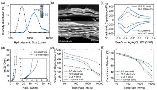 (a) Dynamic light scattering of the 6−3 mL fraction (blue) and the 12−9 mL fraction (black); (b) Cross-sectional SEM of the 6−3 electrode and the 12−9 electrode; (c) Cyclic voltammetry curves in 3M H2SO4 electrolyte at different scan rates; (d) EIS curves for electrodes obtained by density gradient centrifugation with a high-frequency range in the inset; (e) Gravimetric capacitance vs scan rate; (f) capacitance retention of the BS−0.25 h sonic (red triangles), PS−1.0 h sonic (green triangles), 6−3 electrode (blue squares), and the 12−9 electrode (black circles). Reprinted with permission from [45]. Copyright 2018, American Chemical Society.
