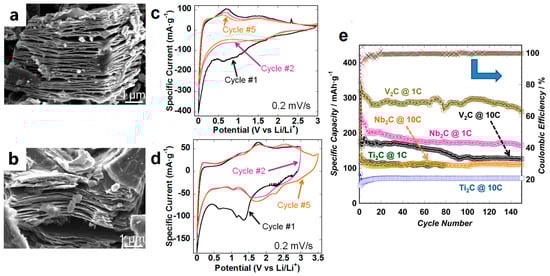It was shown that complicated features of ion storage in Nb-based MXene compound lead to the higher specific capacity of Nb2CTx compared to Ti2CTx [8]. On the other hand, V-based MXenes are promising electrodes for Li-ion batteries due to their good capabilities to handle high charge-discharge rates and the highest Li capacity values among all transition metals [36,49]. For instance, Naguib et al. [30] have demonstrated great perspectives of the layered Nb2CTx and V2CTx powders (see Figure 5a,b), fabricated via a selective etching approach, as electrode materials in Li-ion batteries for high-power applications. According to the cyclic voltammetry (CV) investigations (see Figure 5c,d), the electrochemical performance and voltage profile of the MXene materials depends significantly on their chemistry. Thus, for the Nb2CTx no significant lithiathian/delithiaton capacity has been observed at the voltages above 2.5 V, while CV curves of V2CTx exhibited larger capacity at voltages close to the 3 V. On the other hand, both Nb2CTx and V2CTx showed excellent capability (110 mAh/g for Nb2CTx and 125 mAh/g for V2CTx after 150 cycles) and good reversible capacity (99.6% for Nb2CTx and 98% for V2CTx) at high cycling rate of 10C (see Figure 5e). Authors have also demonstrated that in addition to the MXene chemistry, the great effect of the powder processing. Thus, V2CTx, produced from the milled V2AlC MAX phase, showed significant enhancement in Li uptake (>30%) compared to the MXene material produced from the unmilled MAX phase. The improvement in Li uptaking process authors explained by the decreased particle sizes and, as a result, faster Li diffusion between layers.