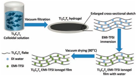 To date, most of the research has focused on developing a variety of high-performance MXene-based electrode materials and fewer efforts have been devoted to investigating the effect of different electrolytes on MXene-based supercapacitors. The appropriate choice of electrolyte is very important and plays an important role in improving the supercapacitive performances of specific capacitance, energy density, power density and long-cycle durability [107]. A limited potential window of aqueous electrolytes (up to 1.2 V) restricts their practical SC device applications. On the contrary, organic electrolytes can offer higher potential up to 4 V which is beneficial for increasing higher energy density, but the high resistance and high-water content of the organic electrolytes limit the power density and practical working voltage of the SC device [108]. Among different types of electrolytes, it has been observed that room-temperature ionic liquids (RTILs) proved themselves as a promising alternative due to their high stability, low flammability and wide potential (up to 4.0 V) ability. However, RTILs as electrolytes for SC offer lower practical capacitance compared with aqueous and organic electrolytes because of their larger cation sizes such as these of 1-ethly-3-methylimidazolium (EMIM+), 1-buty1-3-methy1imidazo1ium (BMIM+), l-hexyl-3-methylimidazolium (FIMIM+), and l-octyl-3-methylimidazolium (OMIM+) than the commonly used cations (e.g., H+, Li+, Na+, and K+) of aqueous electrolytes. The accessibility and fast transport of large-size RTIL-electrolyte cations are limited by the lower interlayer spacing (d-spacing) of electrode materials leading to lower capacitance values [25]. Simon et al. reported the supercapacitor application in 1-Ethyl-3-methylimidazolium bis(trifluoromethylsulfonyl) imide (EMI-TFSI) IL electrolyte of the Ti3C2Tx MXene ionogel film, synthesized via vacuum filtration approach (Figure 9). They observed that due to the structure disordering of the Ti3C2Tx hydrogel film and generated available stable spacing during the vacuum drying, the surface of Ti3C2Tx MXene ionogel film became accessible to a larger number of EMI+ and TFSI- ions. This Ti3C2Tx hydrogel offered capacitance values of 70 F/g in a voltage window of 3 V in EMI-TFSI [109].