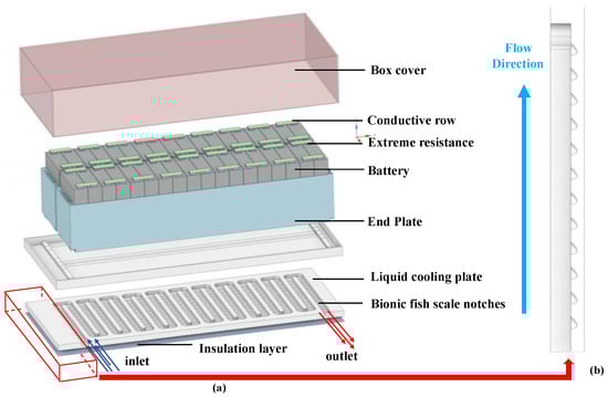 The optimized battery pack model based on the BFS structure is constructed, as shown in Figure 1a. The battery pack is composed of 36 lithium batteries with a capacity of 50 Ah in series. The electrodes on both sides of each cell are connected by series connection. The optimized liquid cooling plate is connected to the bottom of the cell by a heat-conducting pad. This liquid cooling plate consists of an inlet and an outlet. The flow channel is a serpentine flow channel [30], which is commonly used in industrial manufacturing today, and a BFS notch is added to it. The coolant in the liquid cooling plate is water, and its good specific heat capacity can effectively achieve the heat dissipation effect [31]. The coolant entering the liquid cooling plate is heat exchanged with the battery through the internal serpentine flow channel, and the heated coolant is discharged through the outlet. It is essential to note that the coolant flow shall enter from the blunt tip of the BFS notch as a way to ensure the effectiveness of this optimized structure, as shown in Figure 1b. Due to this structure, this liquid cooling system can reduce both the maximum pack temperature and the pack temperature inhomogeneity. It is also highly expandable, allowing for rapid modular design for different pack sizes. The entire battery pack is packaged using end caps and insulation pads to ensure the safety of the experiment. The dimensions and thermal properties of the core components of the pack are given in Table 1.
