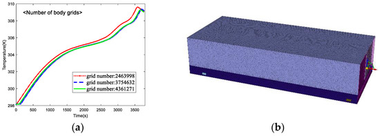 In order to find the optimal number of meshes for the calculation, a sensitivity analysis is performed on the BTMS. Inappropriate number of meshes in Fluent may lead to poor mesh quality, which can cause the body mesh to fail in the calculation. Therefore, the number of bodies meshes is set between 1 million and 5 million. For a flow velocity of 0.3 m/s, the calculation results are shown in Figure 3a. There is some deviation in data when the grid number is low. When the grid number reaches 3.7 million or more, there is almost no difference in the temperature calculation results at different grid numbers. Therefore, in order to ensure the accuracy of the settlement results and the rapidity of the calculation, a grid number of 4 million is used for the calculation in this study. The face mesh parameters are 2.5 to 24.77 mm and the body mesh parameter is 20 mm. The grid structure of the battery pack is shown in Figure 3b.