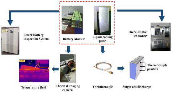 A total of 36 ternary Lithium batteries with a capacity of 50 Ah are used in series for the experiment. The basic parameters of the Lithium batteries are shown in Table 2. Compared with the batteries used in daily life, the rated capacity of 50 Ah has a discharge current of 50 A at 1C, which involves a lot of heat generation and also places a high demand on the BTMS for heat dissipation. Experiments are conducted using the power battery testing system, thermostatic chamber, as shown in Figure 4. The experiment starts with an initial temperature setting of 25 °C at room temperature and 1C discharge. The coolant uses water, and the pump flow velocity is set to 0.28 m/s. The temperature change of the conductive row of the battery module is recorded every 30 s during the discharge process using a thermal imaging camera. The experimental condition also continues to be used for experimental validation after subsequent replacement of the liquid cooling plate with BFS channel.
