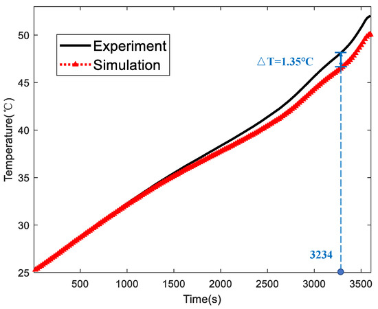 To verify the accuracy of the thermal model, CFD calculation is performed according to Table 3. In addition, three thermocouples are placed from top to bottom on the surface of the single cell for temperature acquisition with the experimental test setup described above. After 3600 s of 1C discharge, the average value of the three thermocouples was calculated as the experimental results. The comparison of the simulated temperature with the actual temperature is shown as Figure 5. Compared to the actual temperature, the simulated temperature shows a maximum error of 2.83% at the 3234th second, which is within acceptable limits. This indicates that the accuracy of the established cell thermal model can be used for thermal simulation calculations of liquid cooling BTMS.