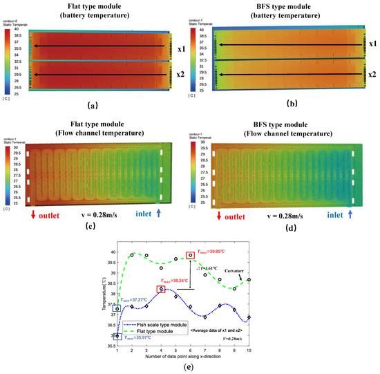 (a) Thermal cloud of cell pack at of flat type channel (b) Thermal cloud of cell pack at of BFS type channel (c) Thermal cloud of liquid cooling plate at of flat type channel (d) Thermal cloud of liquid cooling plate at of BFS type channel (e) Comparison of average values of temperature along x1 and x2 for both structures.