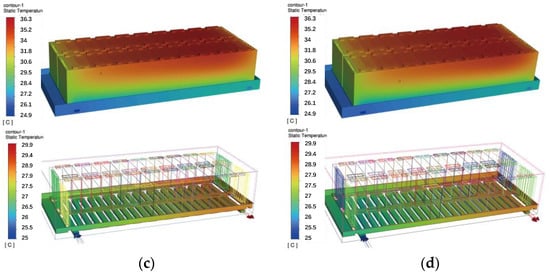 (a) Temperature cloud of the battery pack for group I (b) Temperature cloud of the battery pack for group III (c) Temperature cloud of the battery pack for group XII (d) Temperature cloud of the battery pack for group XVI.