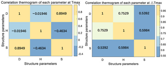Further, the influence between the structural parameters under each indicator is analyzed. The correlation between the three parameters is shown as Figure 9. For , there is a strong correlation between D and S, with a correlation coefficient of 0.8949, while there is almost no correlation between D and H, with a correlation coefficient of −0.01946. Therefore, the strong correlation between S and D should be fully considered for the optimal structural design of , and the parameter designs of S and D are relatively independent compared to H which means the correlation between them can be ignored. For Δ, the correlation between the parameters is not strong. The correlation coefficient between D and H is 0.7529, while the correlation coefficients of the other two parameters are about 0.5. It is indicated that the selection and adjustment of the three parameters should be adjusted in a small range to optimize the structural design of Δ. Therefore, the parameter design of Δ is more difficult than that of , which indicates that the temperature difference is more important in BTMS and more difficult to regulate.