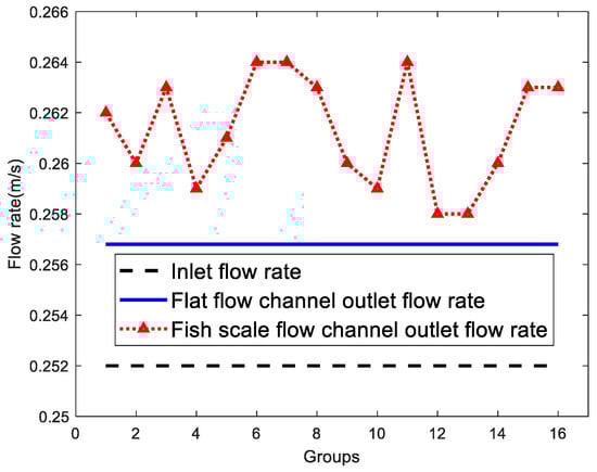 Comparison of the inlet and outlet flow velocity of 16 groups of BFS channels and the inlet and outlet flow velocity of flat flow channels.