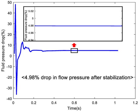 Since the set initial flow rate of 0.28 m/s is the flow velocity in the water pump and the coolant is buffered somewhat before it enters the liquid cooling plate. Therefore, the flow velocity in the liquid cooling plate will be somewhat lower than the flow velocity in the water pump. After the steady state, the outlet flow velocities all have different degrees of increase from 0.258 m/s to 0.264 m/s compared to the flow velocity of 0.257 m/s at the outlet of the flat plate type flow channel, as shown in Figure 11. In addition, the flow channel pressure under this structure is reduced by 4.98%, as shown in Figure 12. In summary, this bionic notch structure can enhance the flow velocity by a maximum of 2.72% and reduce the flow pressure by 4.98%.