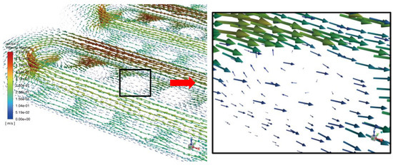 In order to investigate the principle of drag reduction in this structure, the fluid vector diagram of the liquid cooling plate flow channel is analyzed, as shown in Figure 13. It can be seen that a vortex of fluid is generated in the BFS groove microstructure as shown in Figure 14. The fluid vector diagram shows that this structure acts as a “mechanical gear” to push the coolant forward, greatly reducing the friction of the coolant and allowing the fluid to flow through the flow path efficiently. The tiny vortex formed in this structure creates a convection flow with the main flow direction of the coolant, which avoids direct collision between the coolant and the liquid cooling plate. As a result, the friction between the water and the liquid cooling plate becomes a water-to-water friction, reducing the friction during travel and acting as a drag reduction.