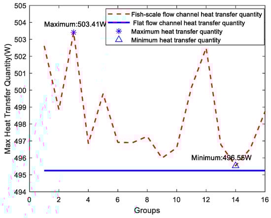 To further verify the effectiveness of the above structure, the maximum heat transfer quantity between the liquid cooling plate and the battery module is counted, as shown in Figure 16. With the different parameters of the BFS structure, the drag reduction effect is different. The resulting flow velocity at different drag reduction effect also leads to a change in the heat transfer quantity. It can be seen that the distribution of the maximum heat transfer quantity between the cell and the liquid cooling plate is approximately the same as the flow velocity distribution in Section 4.2. The maximum heat transfer quantity of 503.41 W is reached at the third set. Its corresponding flow velocity is 0.263 m/s, which is second only to the maximum flow velocity of 0.264 m/s.