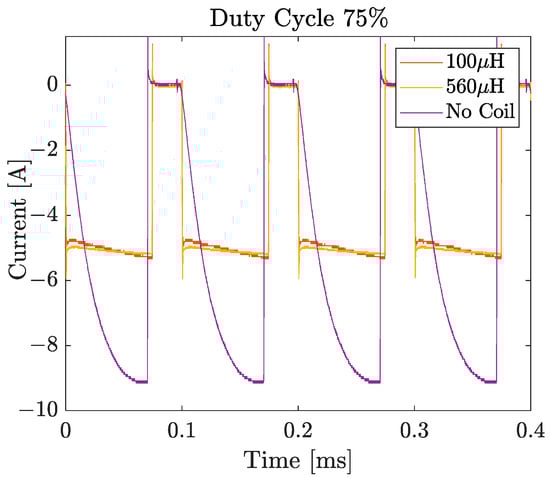 With an oscilloscope and a current probe CP030A, the current passing the cell during pulsing was detected. In order to avoid current peaks clearly higher than the maximum current of 5 A caused by the dynamic control behavior of the Arbin test bench when the cell is switched on and off by the switching board, an inductor is included. A coil with an inductance of 560 µH is found to be optimum and is included in the test setup. In Figure 2, the measured currents obtained for coils with 0, 100, and 560 µH using 10 kHz are given for the representative example of a 75% duty cycle.