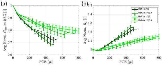 The relative discharge capacity at 0.5 C and the relative internal resistance are presented in Figure 3 as a function of the full cycle equivalents (FCE) for the reference tests. The reference tests vary in charge and discharge current rate, and each test condition is evaluated for two cells, respectively. The curve represents the average capacity loss/resistance increase, while the error bar represents the highest and lowest value within the specific test condition. The first entry states the average charge, and the second the average discharge current during cycling.