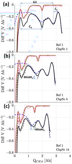 The dV/dQ-plot of reference 1 to highlight the characteristic peaks of the anode and the cathode obtained at (a) checkup #1, (b) checkup #5, and (c) checkup #14. The full cell curve is depicted in black, while the estimated curves are given in dashed blue for the cathode and in red for the anode. In (a), the anode capacity CA is measured by the distance between two graphite peaks and the cathode capacity CC by two cathode peaks. Loss of active lithium, also known as loss of lithium inventory (LLI), is measured by the shift of anode to the cathode. In (b,c), the change in peak height MinHiy of the minimum at 50% lithiation of the graphite is a measure for homogeneity of lithium distribution.