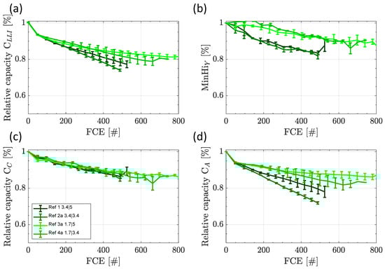 Looking at LLI, the same pattern and nearly the same values are visible as we already observed for the capacity fade in Figure 3a. Regarding losses on the cathode active material, there is a smooth decline down to 85% after 600 FCE, and this trend is not significantly influenced by different charging and discharging currents. The main reason therefore will be that for all test conditions the same derating phase at the end of charge is performed. Therefore, this derating phase essentially defines the time at high cell voltages. The strong impact of a low current phase or CV phase at the end of charge regarding aging was also highlighted by Kannan et al. [31]. More sensitive indicators are loss of anode active material and homogeneity of lithium distribution on the anode. While MinHiY shows lower homogeneity for higher charge currents, discharge currents seem to have no impact on this measure. Comparable observations as for LLI results are found for anode active material losses CA, with a negative influence of higher charge currents and positive effects of higher discharge currents. Zilberman et al. [24] found in their work for the same cell type a large portion of CA losses during calendar aging.