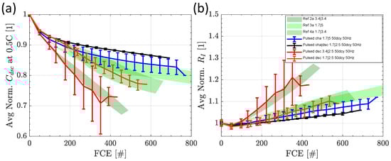 Normalized discharge capacity (a) and normalized internal resistance (b) of the cells switched at 50 Hz during discharge (dsc), charge (cha), and charge/discharge (cha/dsc), with average charge and discharge current stated in the legend. The reference tests are presented as areas in the background.