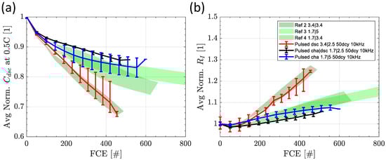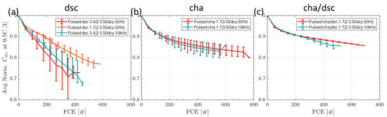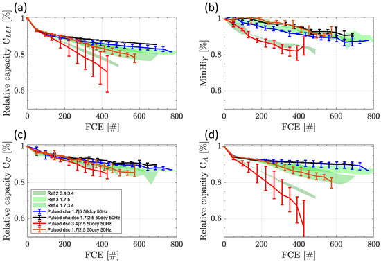 Comparing the absolute results of switching at 50 Hz and 10 kHz with a duty cycle of 50%, we obtain the results in Figure 12. The data are separated for switching during (a) dsc, (b) cha, and (c) cha|dsc. The deviation between the switching frequencies is rather small and shows no clear tendency. For cha, no deviation is measured. For cha|dsc, there is a worse trend for 10 kHz from 300 FCE on. For dsc, at 50 Hz, the aging is stronger from the beginning, while the scattering of the data for both frequencies has a strong overlap. In an overall comparison, the difference in frequencies is still lower than the lower charge current of the 50 Hz dsc low current experiment.