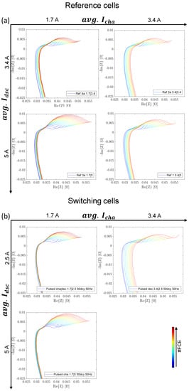 Nyquist diagrams (a) of the reference cells and (b) of the switching cells at 50 Hz, arranged in a matrix according to their average charge and discharge currents. EIS are obtained at 100% SOC in the frequency range from 80 mHz to 5 kHz.