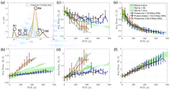 As the curve shape is very similar for all test conditions, we used the GDRT method for evaluation. Figure 9a shows exemplarily the GDRT of a switching cell. To analyze the obtained data from the EC-Idea tool, the normalized values of the resistances and their corresponding capacitances are used. The GDRT identifies six peaks. The area underneath each peak resembles the value of the resistance R of one RC element. The time constant τ, at which the curve reaches its peak, is then used to calculate the corresponding C value according to . Thus, GDRT returns data for five to six RC elements as the peak of R5 disappears in some cases with a higher number of FCE. The same analysis and calculation procedure is applied to all cells and is illustrated in the same manner as for the DVA analysis. The remaining GDRT spectra, including RL-elements, are summarized in Appendix A.