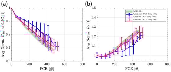Normalized discharge capacity (a) and normalized internal resistance (b) of the switched cells at 10 kHz at 25%, 50%, and 75% duty cycles for the representative example of switching during discharge with average charge and discharge current stated in the legend. The reference tests are presented as areas in the background.