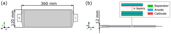 Structure and cell dimensions of the investigated lithium-ion pouch cell referring to Sprenger et al. [27]: (a) Shows the cell’s length and width. (b) Shows the cell’s thickness and layer structure.